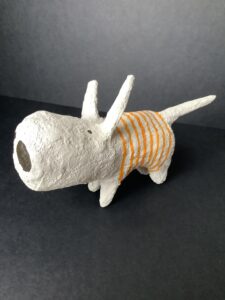 Liten skulptur i papier mache med runda former och målad med akrylfärg