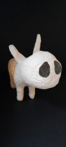 Liten figur i papier mache med runda former och målad med akrylfärg